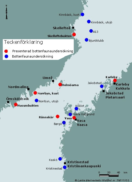 de vanligaste arterna av Bottenfaunans sammansättning påverkas av de naturliga variationerna i t.ex. vattnets salthalt och temperatur samt bottenkvaliteten. Kvarken är unik eftersom den är en övergångszon mellan det saltare vattnet i Bottenhavet och det sötare vattnet i Bottenviken. Kvarken utgör därför den nordliga utbredningsgränsen för många marina arter med ett minimikrav på salthalt. Här kan du läsa mer om salthaltens inverkan, nordliga utbredningsgränser och även läsa om sötvattensarter som lever på utkanten av sitt utbredningsområde i Kvarken. Eftersom bottenfaunan även är känslig för utsläpp av ämnen från mänsklig verksamhet, t.ex. industrier, kan den användas för att bedöma de biologiska effekterna av utsläppen. Här kan du läsa mer om utsläppens biologiska effekter. |